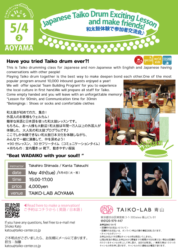 5/4(火・祝)❷Japanese Taiko Drum Exciting Lesson and make friends!