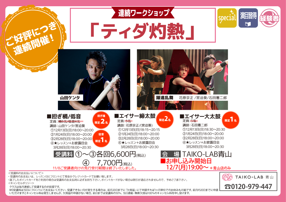 定員:桶6名 限定2名(現在キャンセル待ち) / 低音4名 限定1名(現在キャンセル待ち)