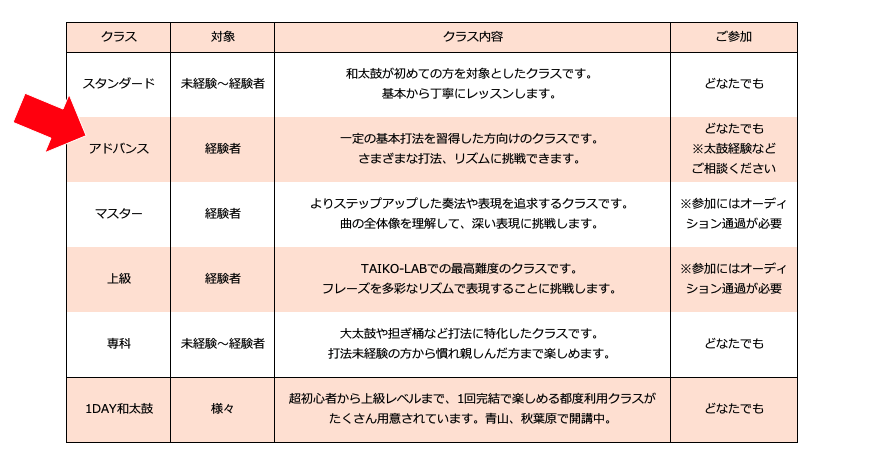 経験者の方はアドバンスクラスや専科クラスからスタートできます。