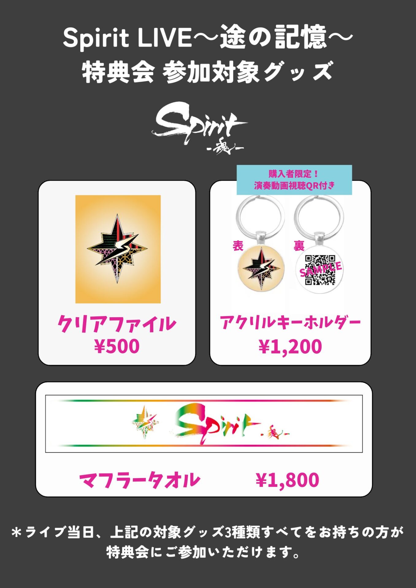 ・対象のグッズ(クリアファイル、アクリルキーホルダー、マフラータオルの3点すべて)をライブ当日にお持ちの方