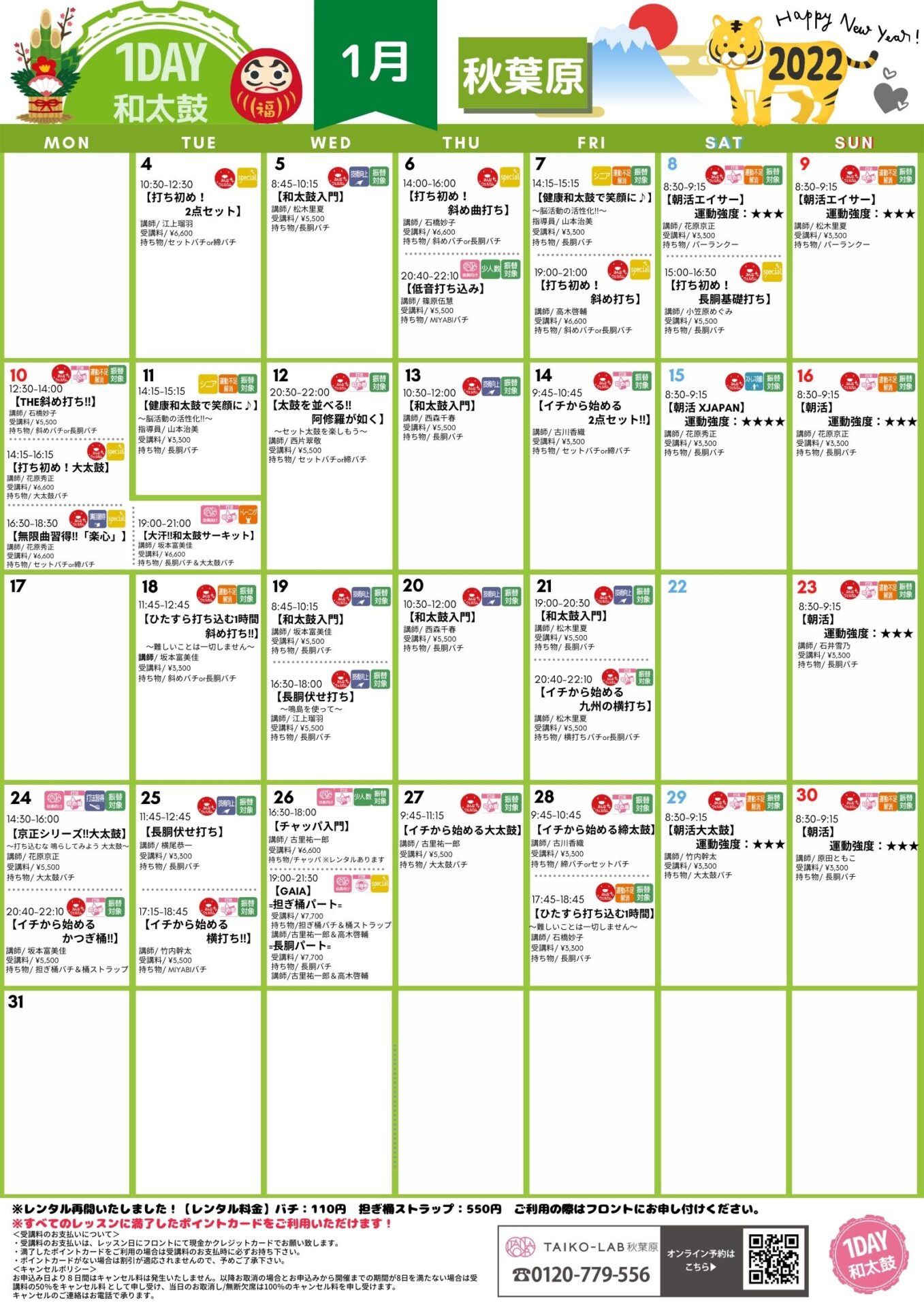 | 1/04(火) | 打ち初め =2点セット= | 10:30-12:30 | 2022年も和太鼓ライフを楽しみましょう♪ いつもと違う打法・先生に習うのも面白いですよ! ぜひ、この機会に(^^)/ | セット | 120分 | 6,600円 | 江上瑠羽 | セットバチ or締バチ |