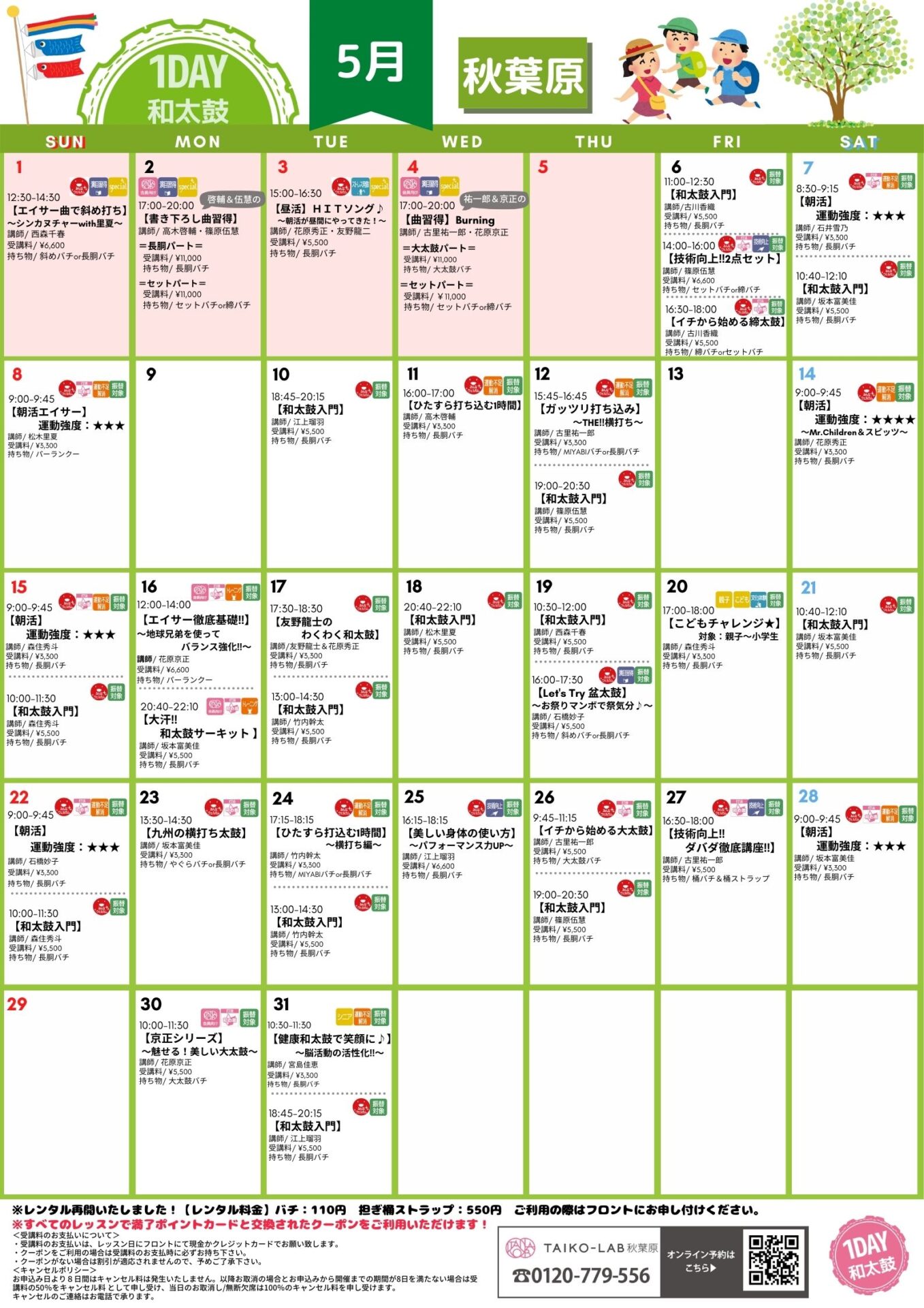 | 5/30(月) | 京正シリーズ 魅せる! 美しい大太鼓 講師:花原京正 | 10:00-11:30 | 大太鼓 | 無限・花原京正に学ぶシリーズです。 打法初心者から取り組める内容なのでお気軽にお越しください。 京正講師ならではの視点でアドバイスがあるかも! | 90分 | 5,500 | 花原京正 | 大太鼓バチ |
