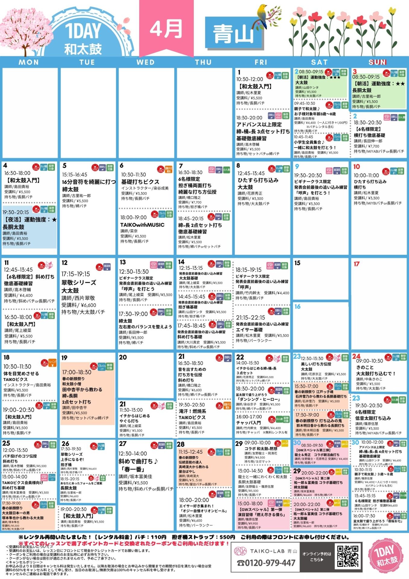 | 4/11(月) 尾上 | 【和太鼓入門】 | 16:30-18:00 | 長胴伏せ打ち | 和太鼓の基礎からしっかりと学ぶことができます★ 和太鼓を習い始めた方はここからスタートできます♪ ※振替OK | 90分 | 5,500円 | 尾上綾菜 | 長胴バチ |
