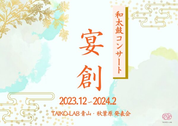 TAIKO-LAB青山・秋葉原に所属の皆様の発表会を、今年は12月・1月・2月の3回の公演にて開催いたします。公演タイトルは「和太鼓コンサート【宴創】」です。ご出演になる会員の皆様お一人お一人が主役の和太鼓コンサートです … 続きを読む 和太鼓コンサート【宴創】2023.12~2024.2